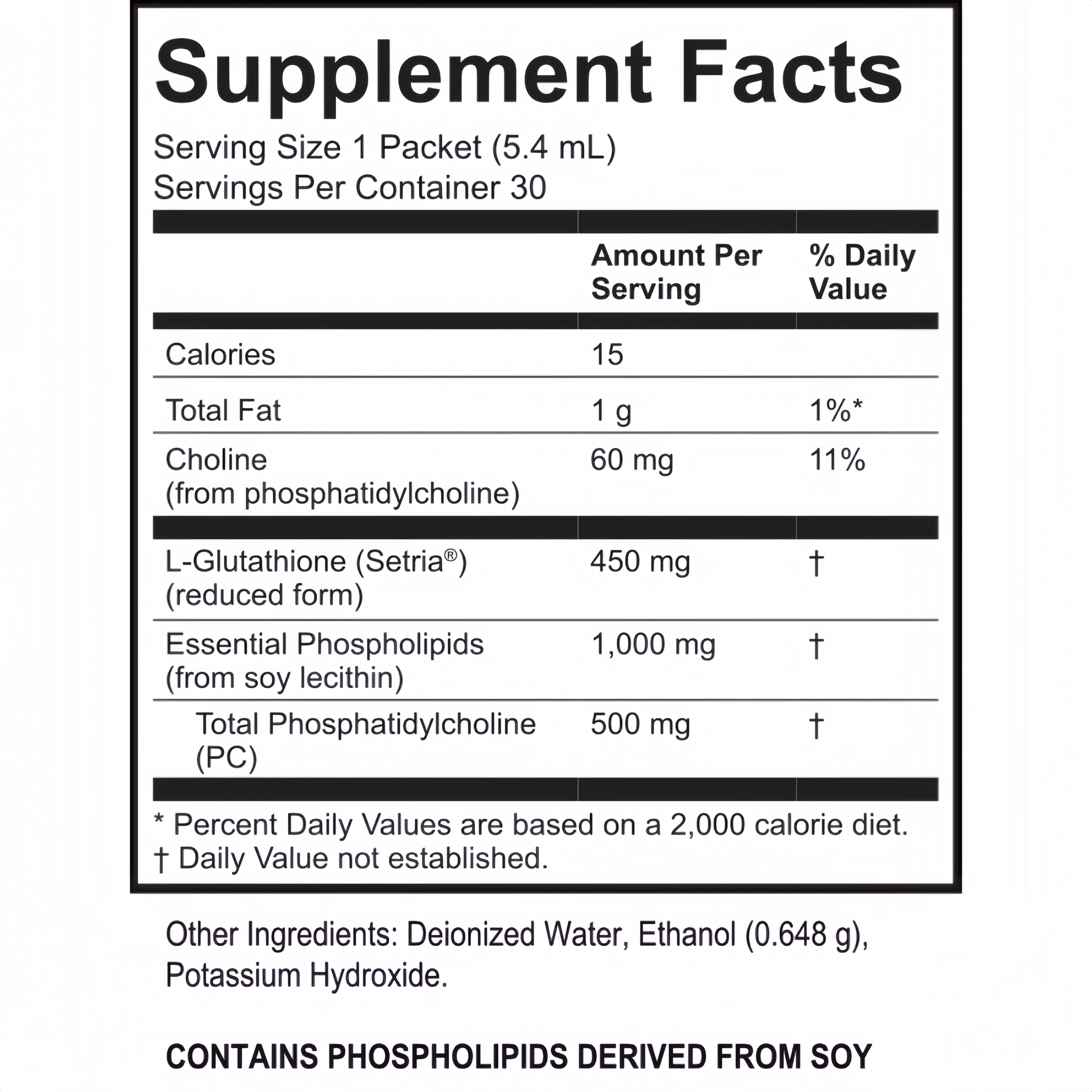 L-Glutathione (Setria®), Choline, Essential Phospholipids (from soy lecithin), Phosphatidycholine, Deionized Water, Ethanol (0.648 g), Potassium Hydroxide